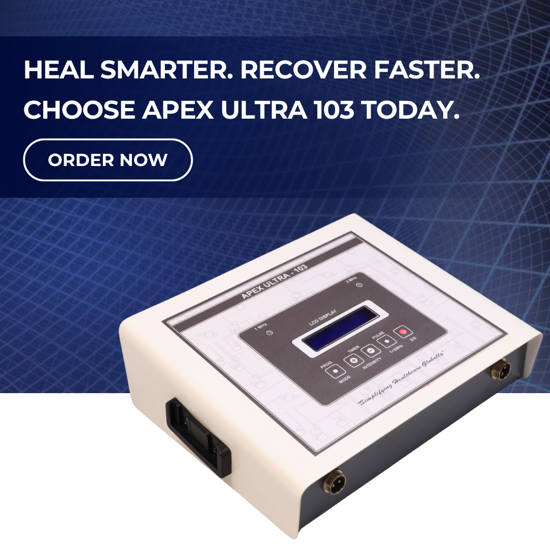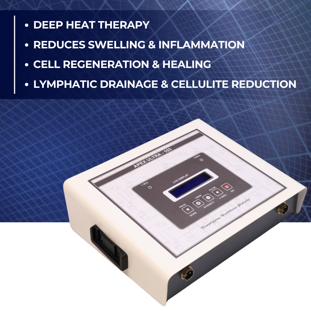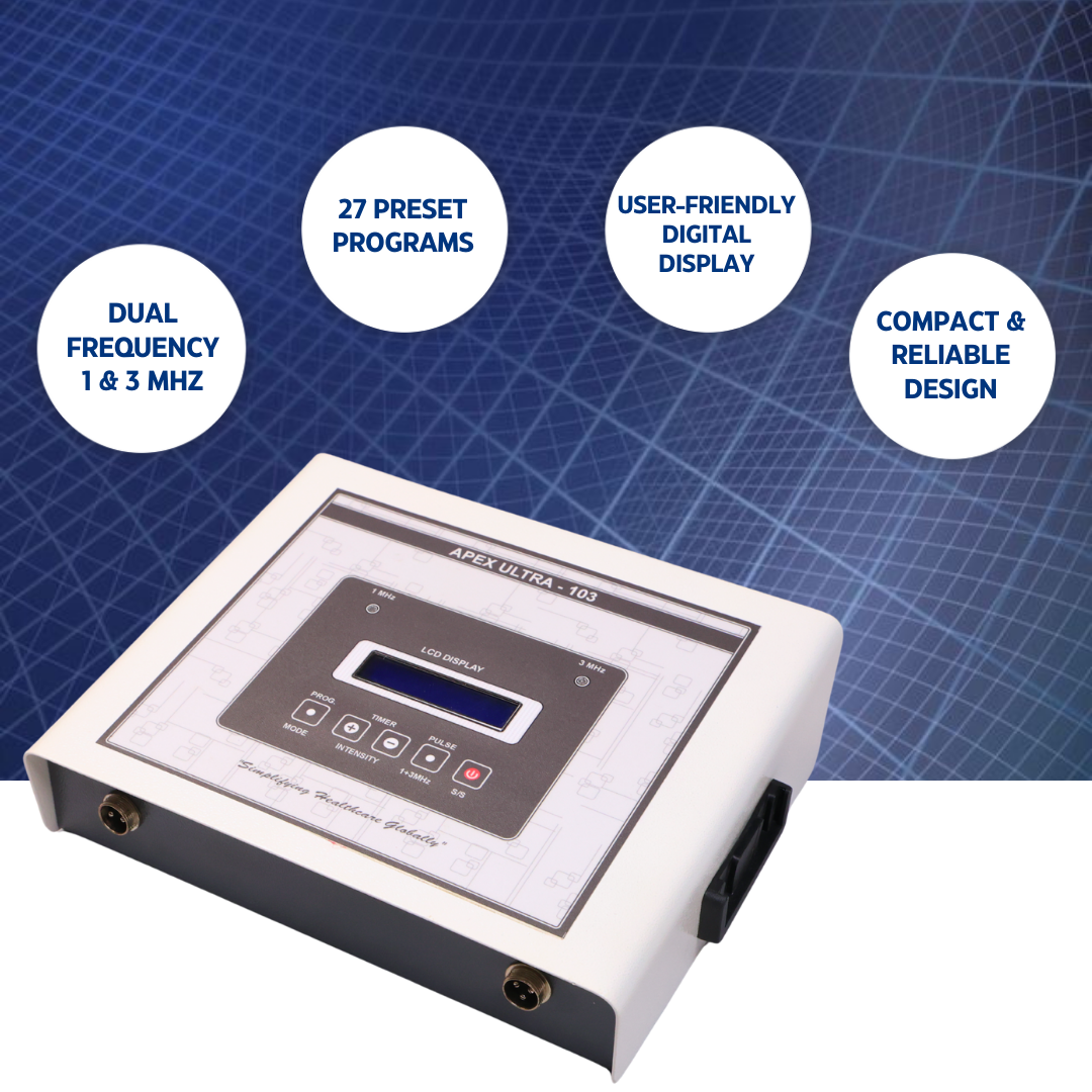 The Apex Ultra 103 is a premium-grade ultrasonic physiotherapy machine designed to deliver effective pain relief and muscle stimulation therapy. Engineered with advanced digital technology, this compact and user-friendly machine features 27 pre-set programs, making it suitable for both clinical and home physiotherapy use.