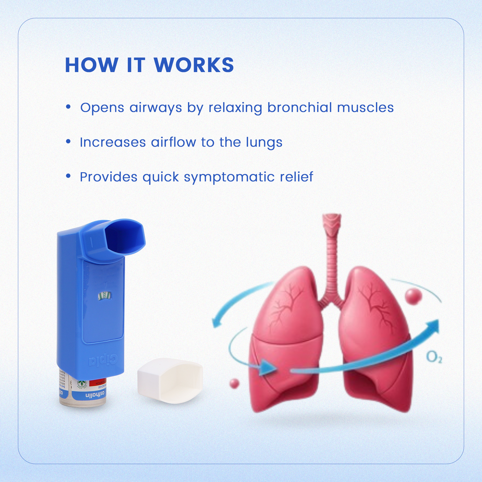 ASTHALIN INHALER is a bronchodilator. It relaxes the smooth muscles of the airways and widens them. It also blocks the release of certain chemical messengers in the airways (such as mast cells) that cause inflammation and swelling. As a result, it reduces airway inflammation, manages the airways from becoming narrow and allows the air to pass through more freely which makes breathing easier.