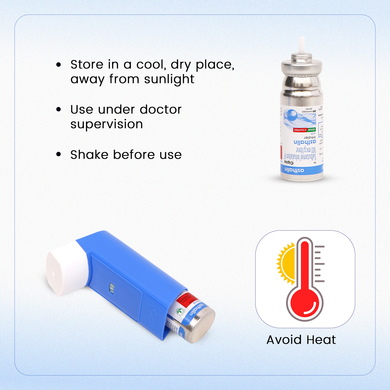 Before using Asthalin 100mcg Inhaler, you should tell your doctor if you have high blood pressure, an overactive thyroid gland, a history of heart problems, diabetes, or low levels of potassium in your blood to make sure it is safe. Also, make sure your doctor knows if you are pregnant or breast-feeding before taking this medicine. This medicine can make you feel dizzy or shaky, therefore, do not drive, use tools, or machinery until you feel better. Avoid smoking as it causes damage to your lungs and will make your condition worse.