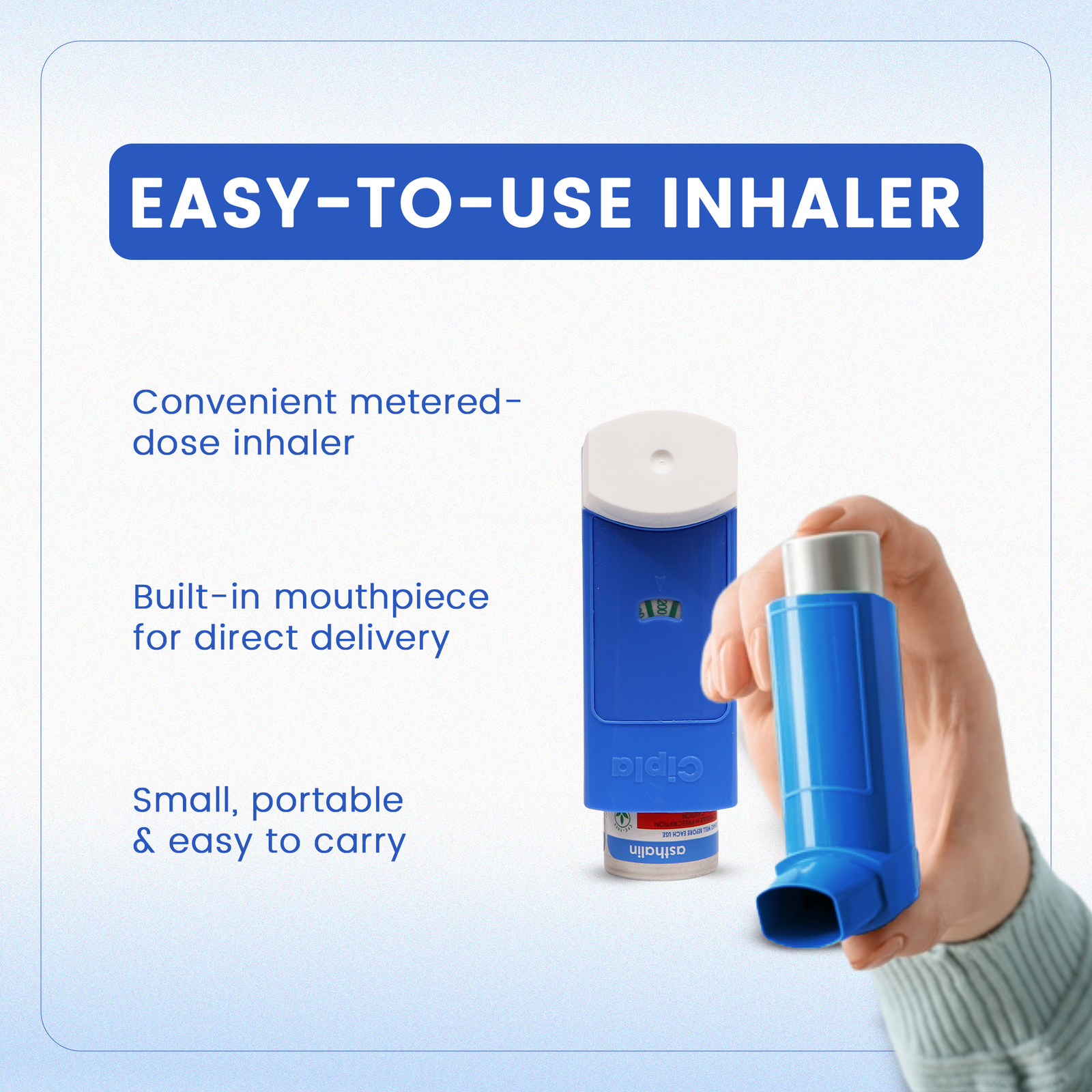 Asthalin 100mcg Inhaler is called “reliever” inhalers because they give you quick relief from breathing problems when you need it. In most cases, you will be given another inhaler to prevent your symptoms (a “preventer”) and you should use this regularly every day. Cipla asthma inhaler works quickly and the effects can last several hours. You can use it at any time of day, but only use it when you notice symptoms, such as coughing, wheezing, shortness of breath, tightness in the chest or you know that you are going to do an activity that can cause breathlessness. When an asthma attack happens, you should take the number of puffs your doctor recommends. There are several types of asthalin inhaler 200 puffs devices, so make sure you know how to use your inhaler correctly, otherwise, it may not work. Do not stop using this medicine unless your doctor tells you to. If you stop, your breathing problems could get worse.