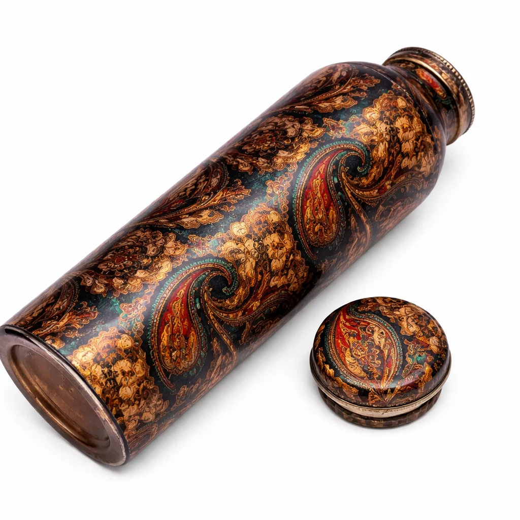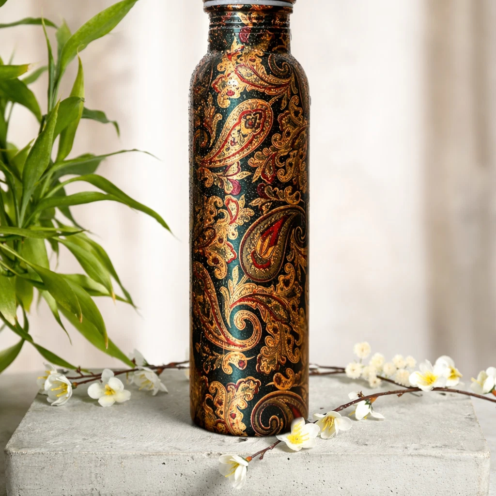 Experience wellness and style with the Brocade Heat Print Copper Water Bottle (1 Litre) — crafted from 100% pure copper to promote Ayurvedic health benefits. This eco-friendly and leak-proof ayurvedic copper water bottle supports natural purification and keeps your water fresh throughout the day.