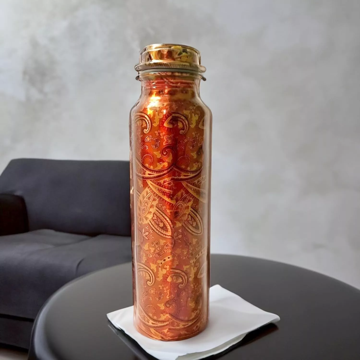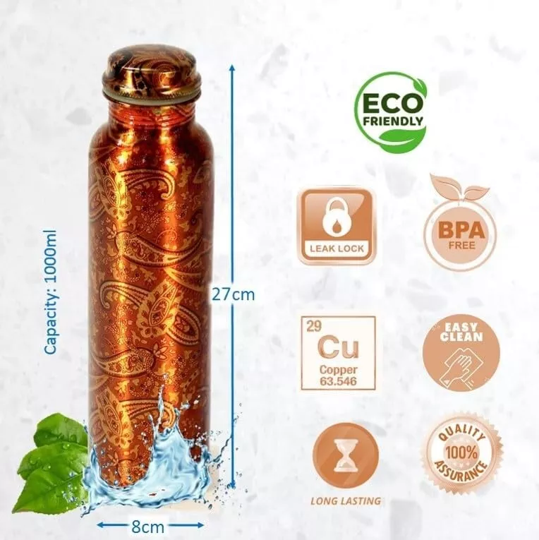 The Red Brocade Pure Copper Water Bottle is designed for general household water storage and daily hydration needs. It features a decorative brocade finish and durable copper construction suitable for regular, non-medical use.