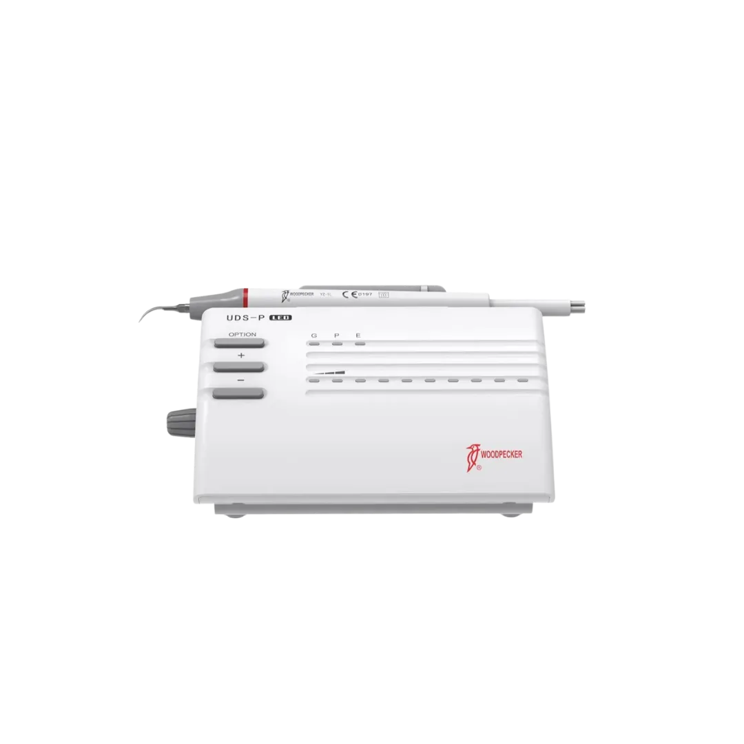 The Woodpecker UDS P LED is an FDA-cleared ultrasonic dental scaler designed for professional dental scaling procedures. Features built-in LED illumination for enhanced visibility during dental prophylaxis.